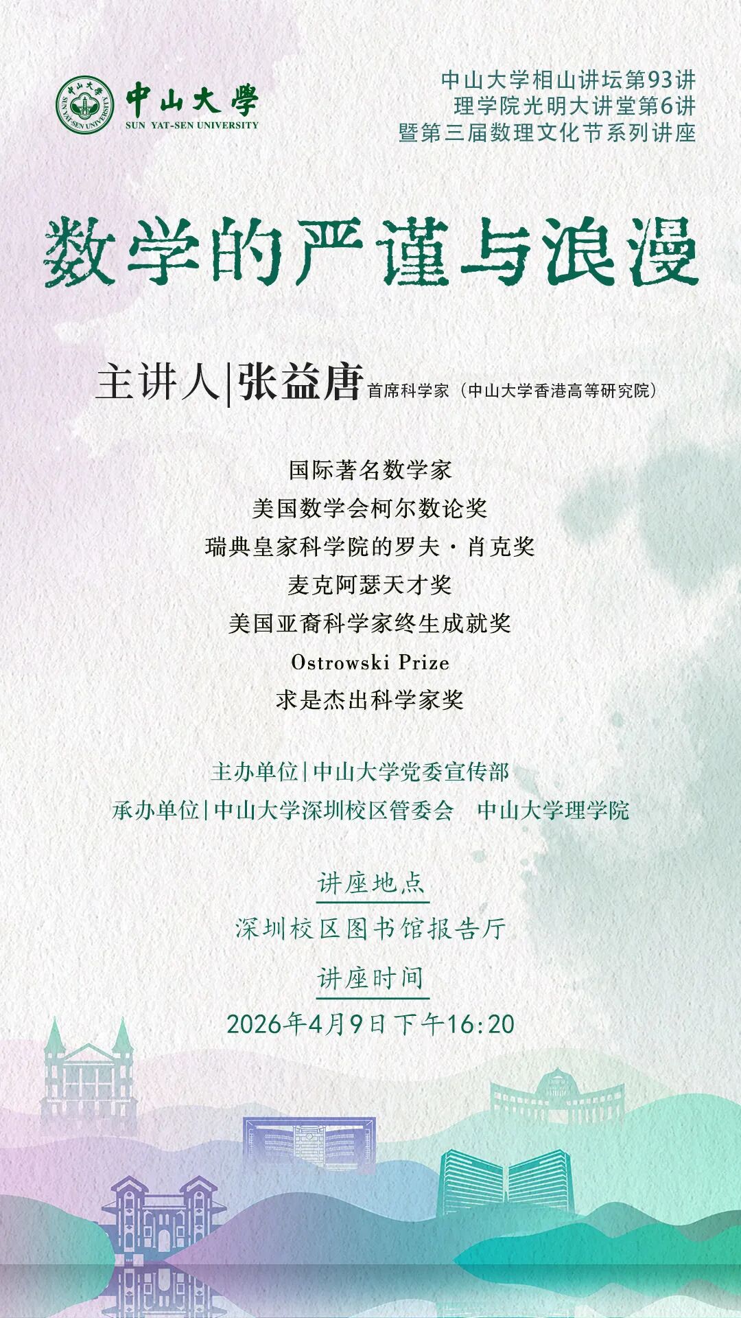 在党和国家的坚强领导下,在教育部、广东省及广州、深圳、珠海等驻地政府的关怀和支持下,中山大学发扬综合性、研究型、开放式的办学特质,加快建设中国特色世界一流大学。今日的中山大学由广州校区、珠海校区、深圳校区等三个校区、五个校园及十家附属医院组成。学校坚持中国特色社会主义办学方向,坚持立德树人根本,以“面向世界科技前沿、面向经济主战场、面向国家重大需求、面向人民生命健康”为基本导向,正迈步向世界一流大学奋进,努力成为全球学术重镇。